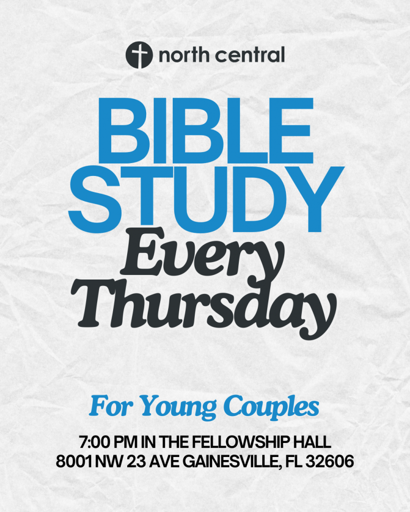 Our Thursday night Young Couples group meets every week for Bible Study and fellowship at 7pm in the Fellowship Hall. This group is for young married couples in their 20s and early 30s. Whether you’ve been married for years, just got married, or are soon-to-be married, you are invited to join us! For more info about this group, you can email us at info@gatorchurch.com or call us at 352-373-3341.
