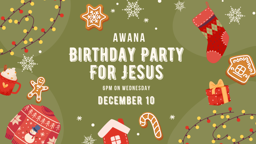Our AWANA Clubbers will be having their annual Birthday Party for Jesus on Wednesday, December 10 at 6:00pm. For more info about our AWANA club, click here.