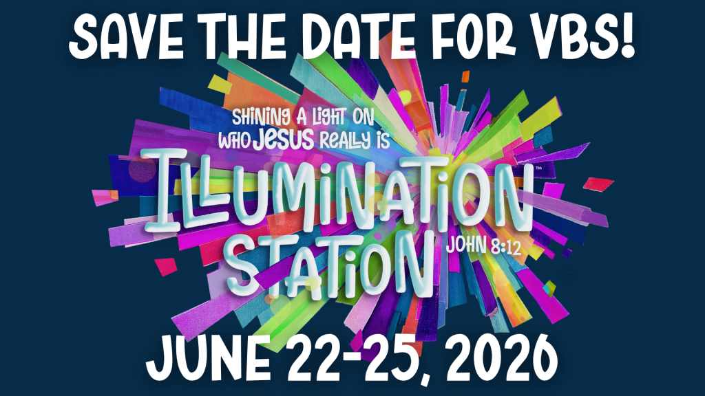 Save the date for VBS 2026! We can’t wait to see kids at Illumination Station where we will be shining a light on who Jesus really is! Online pre-registration will open in February 2026.