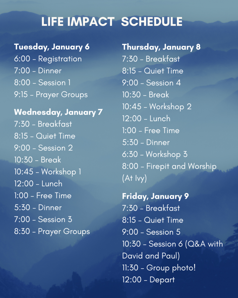 You can register for Life Impact here. $250/person covers registration, lodging, and meals. Pay through Venmo @ncbccollege or check to North Central Baptist Church. Price goes up to $275 on Dec 1st // $30 deposit due at sign-up.